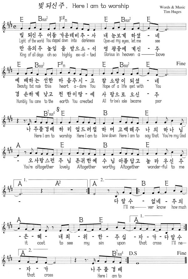 빛 되신 주 악보 가사 Ppt 단기선교 찬양악보 100선 Here I Am To Worship 영어 가사 Mp3