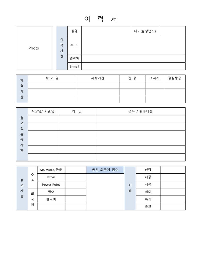 국문 이력서 무료서식 양식 출력용 워드파일