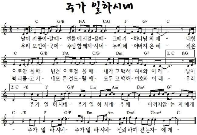 주가 일하시네 날이 저물어 갈 때 빈들에서 걸을 때 C코드 찬양 Ccm 악보 가사 Ppt