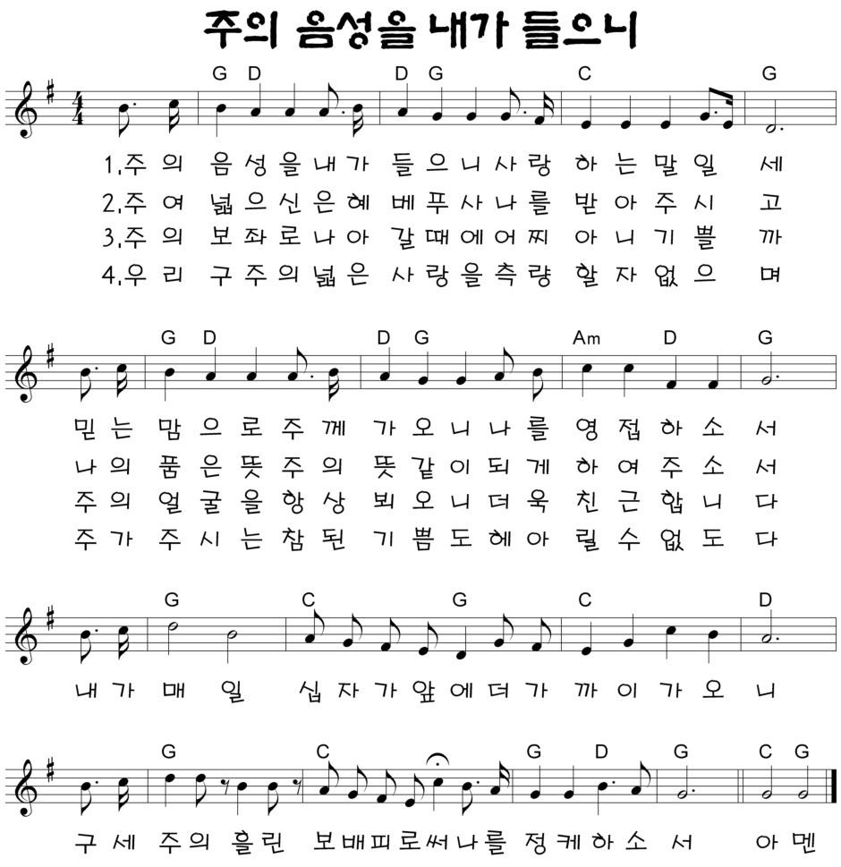 주의 음성을 내가 들으니 G코드 악보 가사 Worship