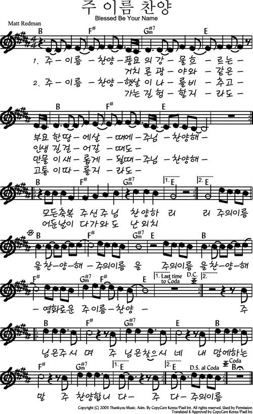 주 이름 찬양 Blessed Be Your Name Matt Redman 한영 가사 악보 네이버 블로그