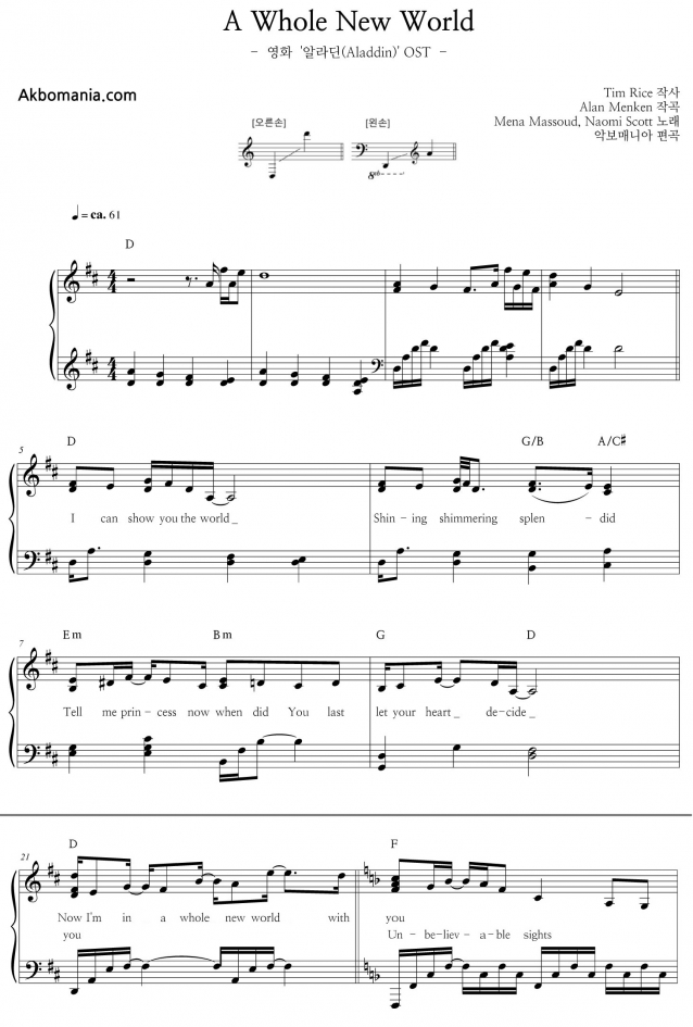 악보 게시판 알라딘 Ost A Whole New World 쉬운 아주쉬운 악보 포함 By 라몽