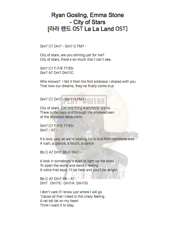 라라랜드 Lala Land Ost 라이언 글로슬링 Ryan Gosling 엠마스톤 Emma Stone City Of Stars 시티 오브 스타 기타 악보 코드 가사 듣기